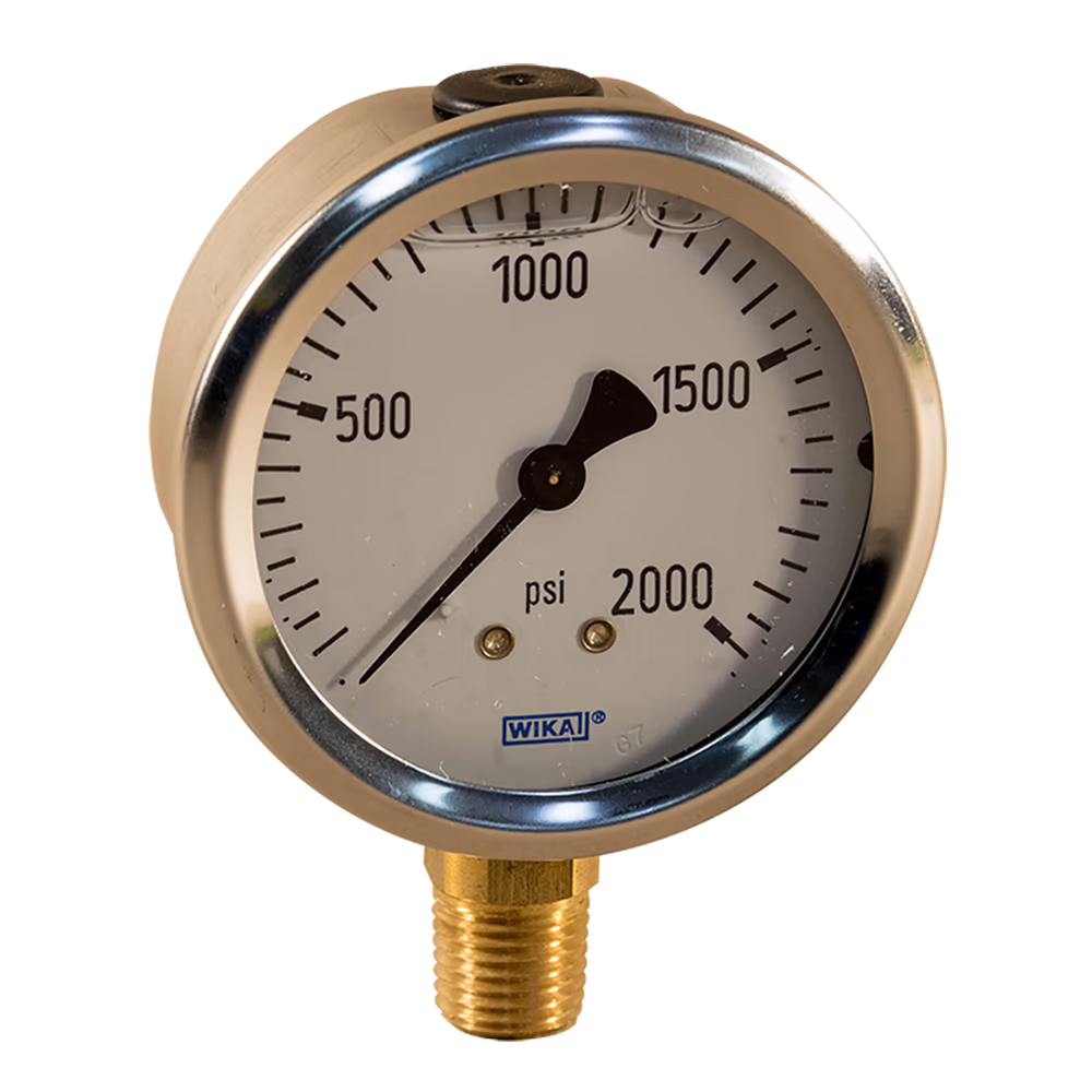 Pressure gauge with 2000PSI scale, stainless steel case and glycerin filled for vibration control.
